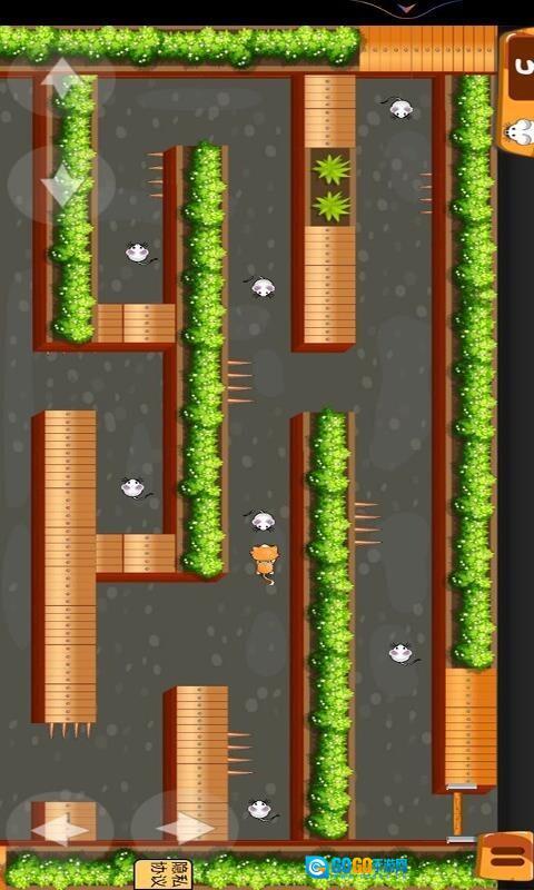 1、进入迷宫关卡后,操控橙色猫咪的方向键位于屏幕两侧,你需要沿着道路移动猫咪,并且优先追捕箭头所指向的老鼠。