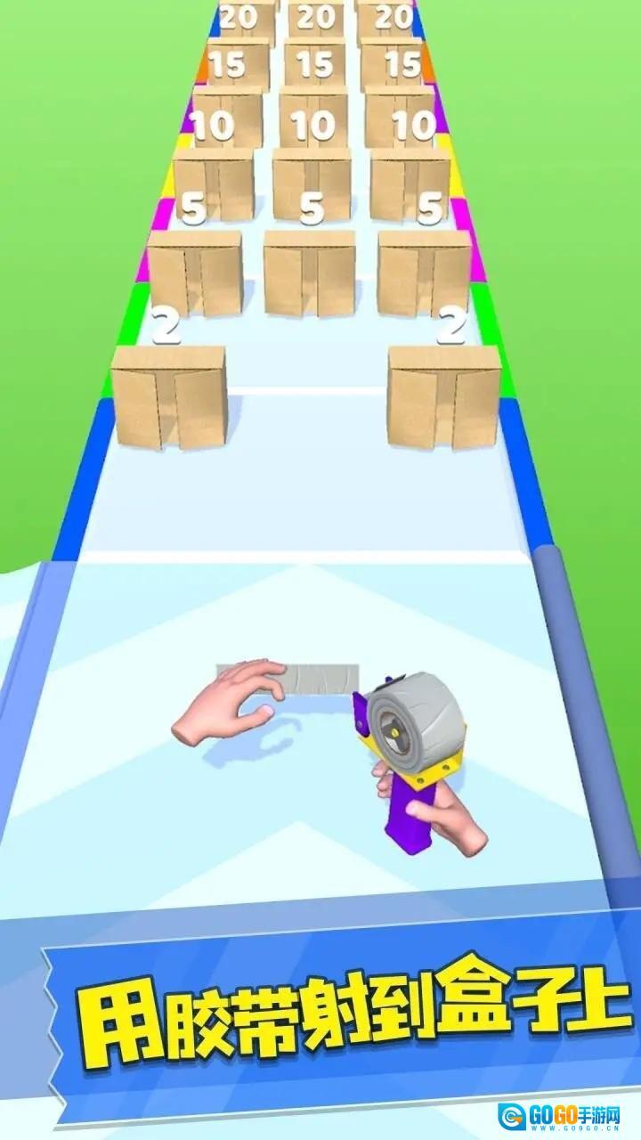 1、进入游戏后,先熟悉胶枪发射胶带的操作方法,在初始跑道上试着向盒子发射胶带,按照数量要求完成分配,开启酷跑之旅。