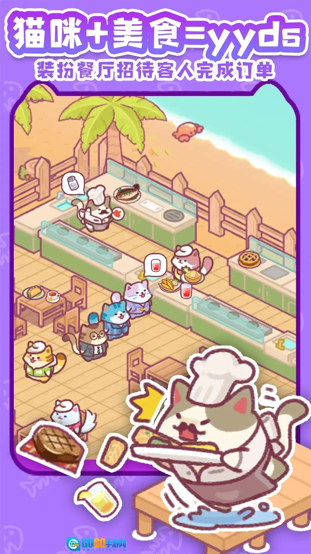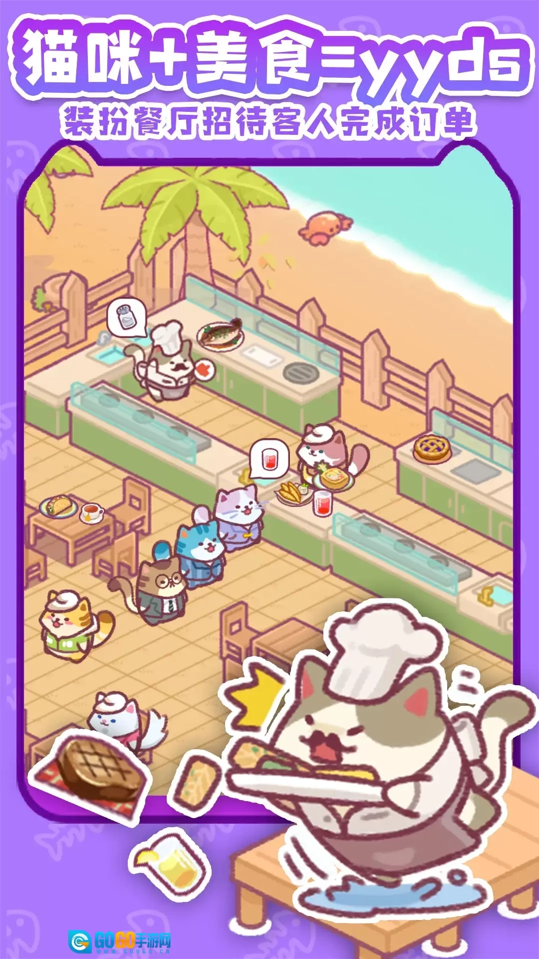 1. 游戏采用温暖舒适的日常风格作为主题,玩家将与一群可爱的猫咪伙伴共同经营属于自己的海鲜店铺。 2. 在游戏里,猫咪们会化身为厨师,制作出各式各样的美食来招待并满足每一位客人。