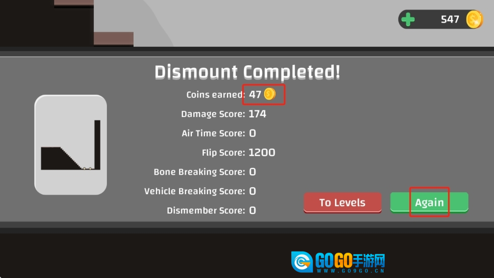 3、结算界面,若未达成1000分目标,点击绿色的Again按钮重玩,调整操作,让火柴人在坠落过程中完成更多能获得高分的动作。