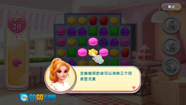 3.游戏里,你可以交换相邻方块,消除三个及以上同类型元素,收集关卡要求的元素达成目标,以此获取金币,金币能用来装扮你的面包店。