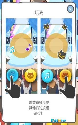 1、游戏设计化繁为简,仅需借助屏幕左右两侧的按键即可进行游玩。当音符与节奏点重合时,按照图案点击对应的按键就行。