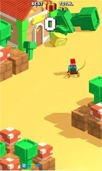 1、场景依次切换为有圣诞树与礼物的雪地、生长着蘑菇和绿建筑的沙漠、分布枯树及机械装置的黑暗森林,玩家驾驶方块车(角色同步换装)进行跑酷。