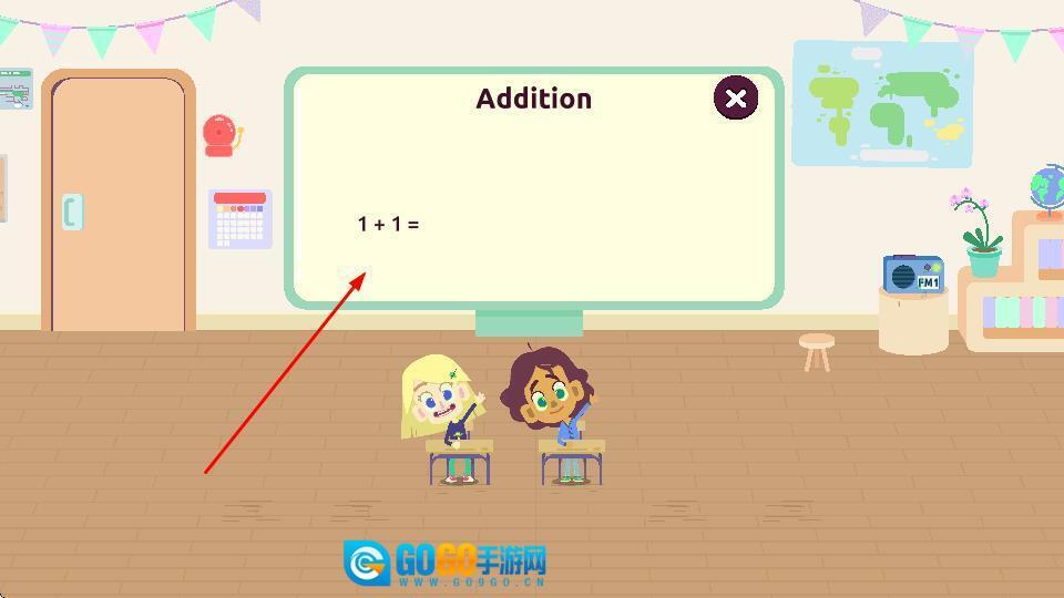 3、当黑板上呈现像1+1=这类基础加法的数学题时,每成功解答一道题目,便能推动游戏进度,开启新的学习关卡,在充满趣味的互动过程中增强数学技能。