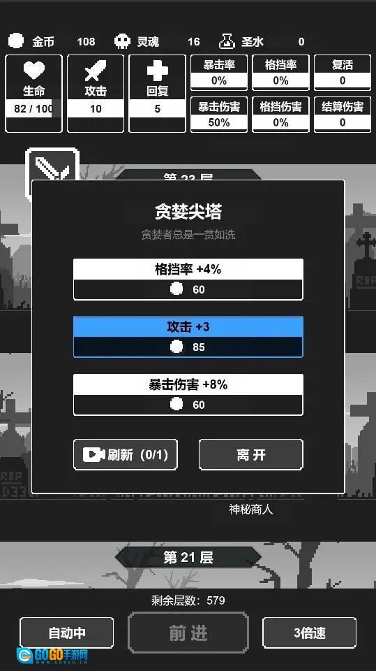 3、这是一款自动格斗游戏,若想主动参与活动,就需要持续获取工件并购买属性,以此来挑战更高的关卡。