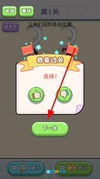 3、当成功引导人物回到各自对应的位置后,即可达成通关条件;通关之后,你可以点击下一关按钮,继续挑战全新的关卡,解锁并体验更多丰富有趣的内容。