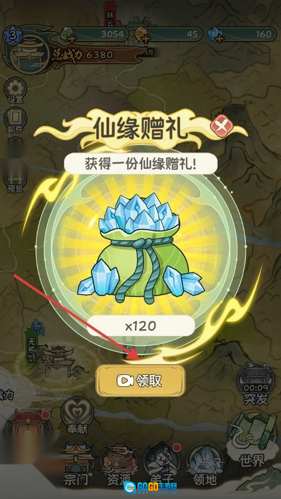 4、当出现【仙缘赠礼】时,点击【领取】按钮,即可获取资源奖励,为宗门发展提供助力。