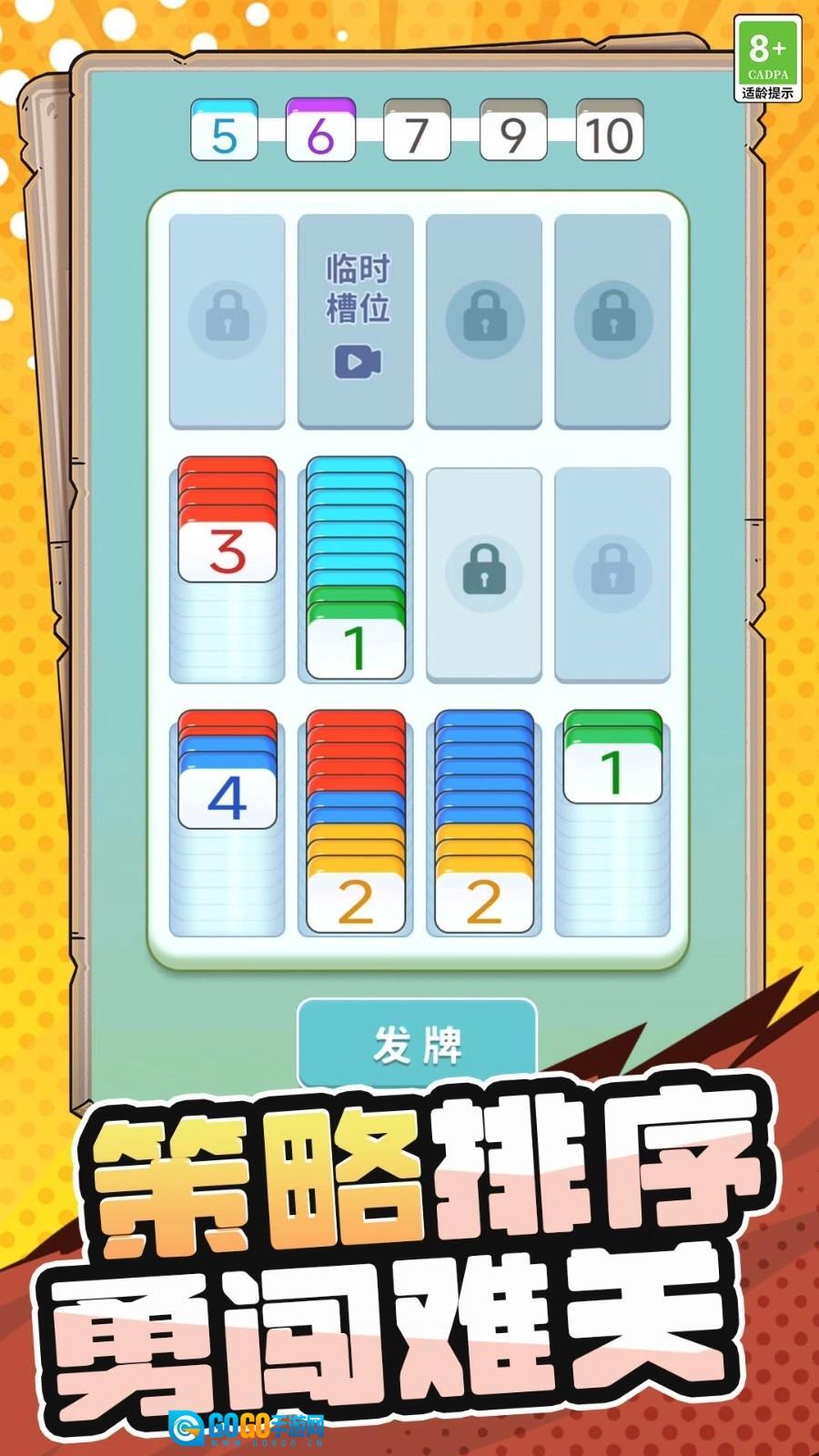 3、设有闯关模式,玩家需运用策略排序技巧,在每一关合理操作卡牌,完成挑战以解锁后续内容。