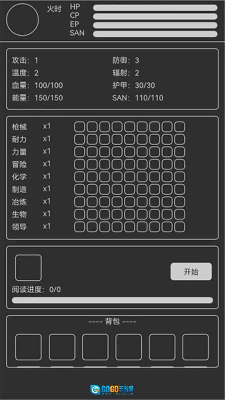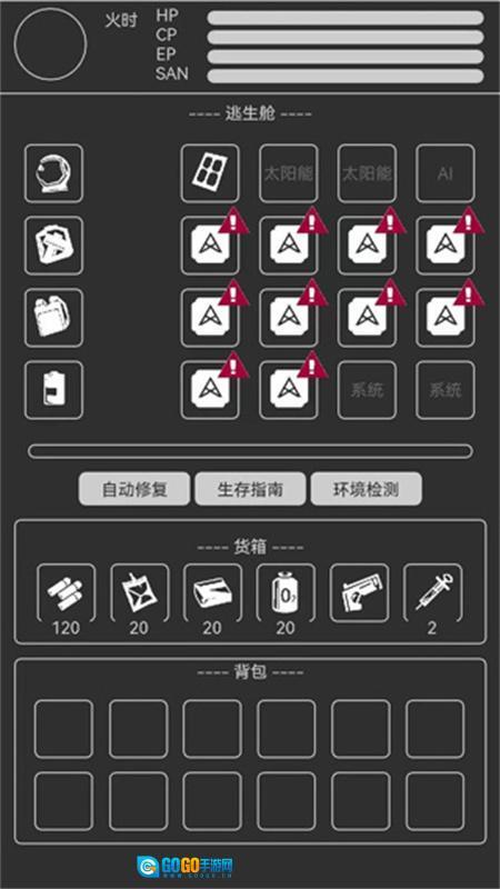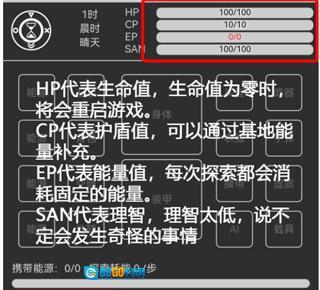 3、HP所指的是生命值,一旦生命值降至零,游戏就会重启;CP对应的是护盾值,该数值能够借助基地能量来补充;EP表示能量值,每次进行探索都会消耗固定数量的能量;SAN代表理智,当理智数值过低时,有可能会出现一些奇怪的状况。