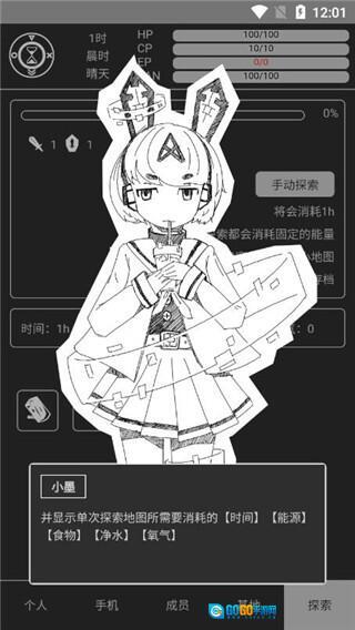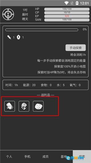 6、点击探索按钮,就能开启地图探索;每次进行探索操作,都会消耗时间、能源、食物、净水、氧气等资源。