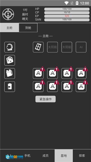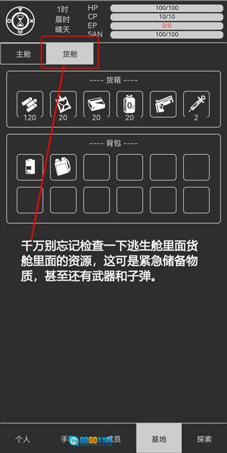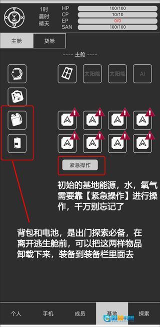 1、基地初期的能源、水和氧气供应需要通过【紧急操作】来维持,这一点一定要记好。背包和电池是外出探索的必需品,在离开逃生舱前,记得把这两样东西从存储位置取出来,装备到对应的装备栏中。