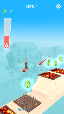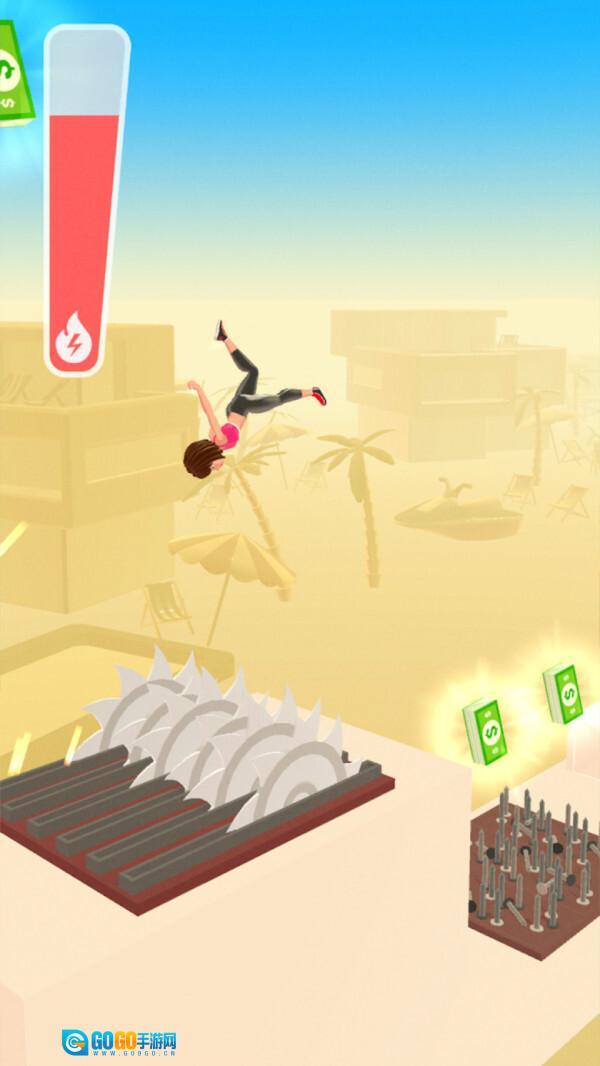 2、角色完成跳跃后,会在空中进行翻转动作,在此过程中要避开路径上的尖刺、火焰等各类障碍,并且收集空中漂浮的钱币,玩家通过操作来控制角色的最终落点,以此体验障碍躲避的核心玩法。