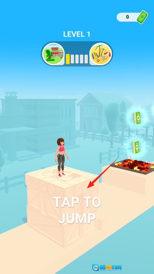 1、来到关卡的起始位置后,点击“TAP TO JUMP”按钮,角色就会向上跃起,过程中会越过各种障碍,同时收集沿途的钱币,以此开启跑酷挑战,亲身感受跳跃启动的机制。