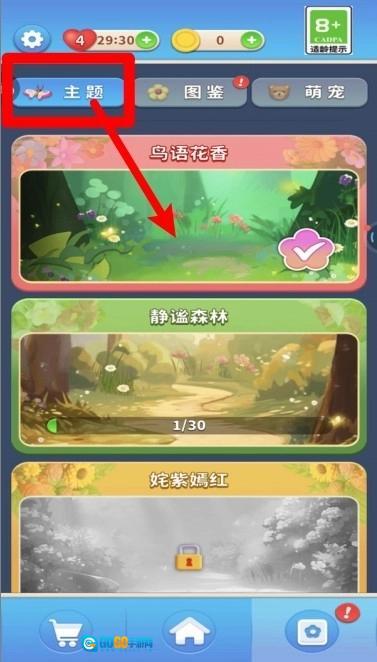1.点击界面左上角的“主题”选项,即可进入背景设置页面。在这里你可以自由切换各类主题场景,解锁相应主题后,还能将背景更换为自己喜欢的花卉风格。