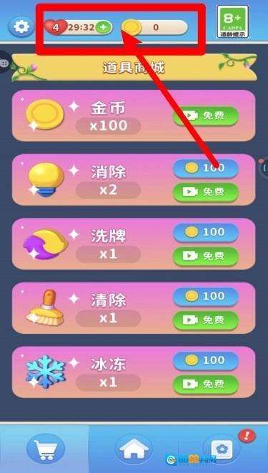 2.画面上方会显示当前的体力值和金币数量,体力会每隔一段时间自动恢复,金币则可以通过闯关或者观看广告来获取和使用。