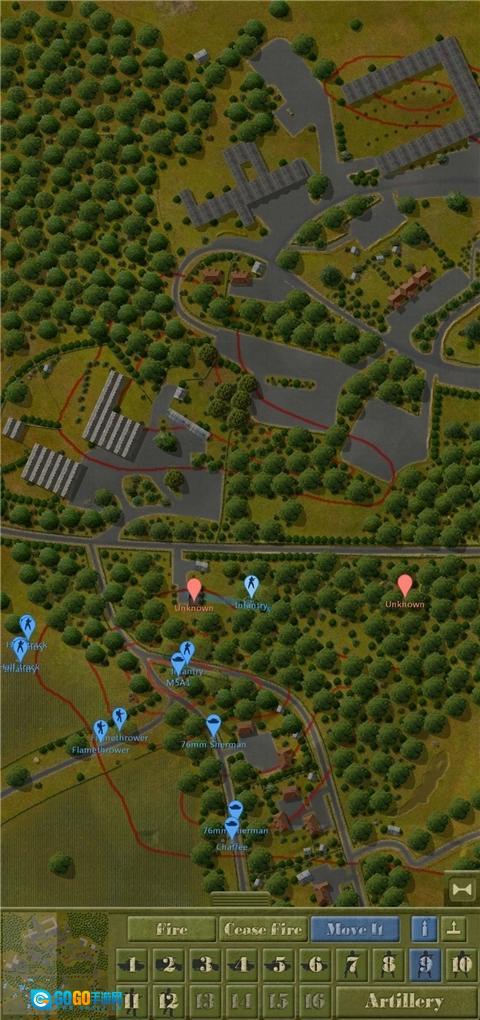 3、从图中能够看出,当前局势十分危急。我方回撤的剩余部队已被敌军察觉,不过因其身处复杂的丛林环境,暂时未受到交叉火力的压制。我随即下令让该部队实施强行突击,并调派M5A1战车予以支援;同时,部署在地图最左侧的机械步兵部队则执行迂回穿插任务——由于该机械步兵团的阵地被遮蔽物所环绕,无需担忧会遭受敌方火力打击。