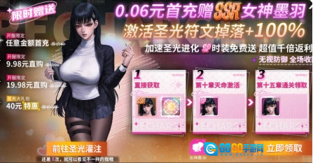 首次充值即可领取圣光墨羽,激活后符文掉落概率提升100%,还有多个充值档位可供选择,帮助你轻松度过前期关卡