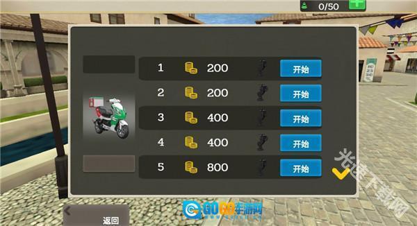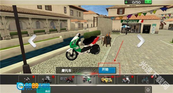 1、首先我们打开游戏,首次进入游戏的时候我们直接一辆小摩托可以使用,我们点击开始