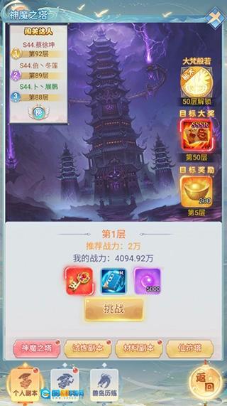 各关卡每日可挑战1次、扫荡1次,限时2分钟,1分钟内通关得3星。高等级开高难度关卡,奖励含各类强化材料。神魔之塔: