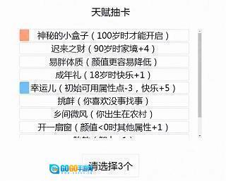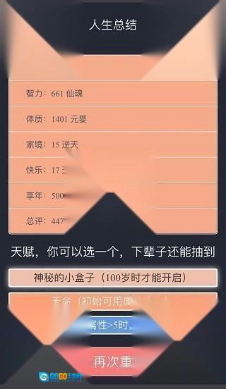 3、建议想活到100岁的玩家选择神秘的小盒子天赋,选了这个天赋就主攻体质,尽量达成活到100岁的目标。要是不选这个天赋,那就主攻智力,去购买乞丐的仙法,同时体质也不能落下。修仙的时候,千万不要选多重人格和克苏鲁这两个选项。