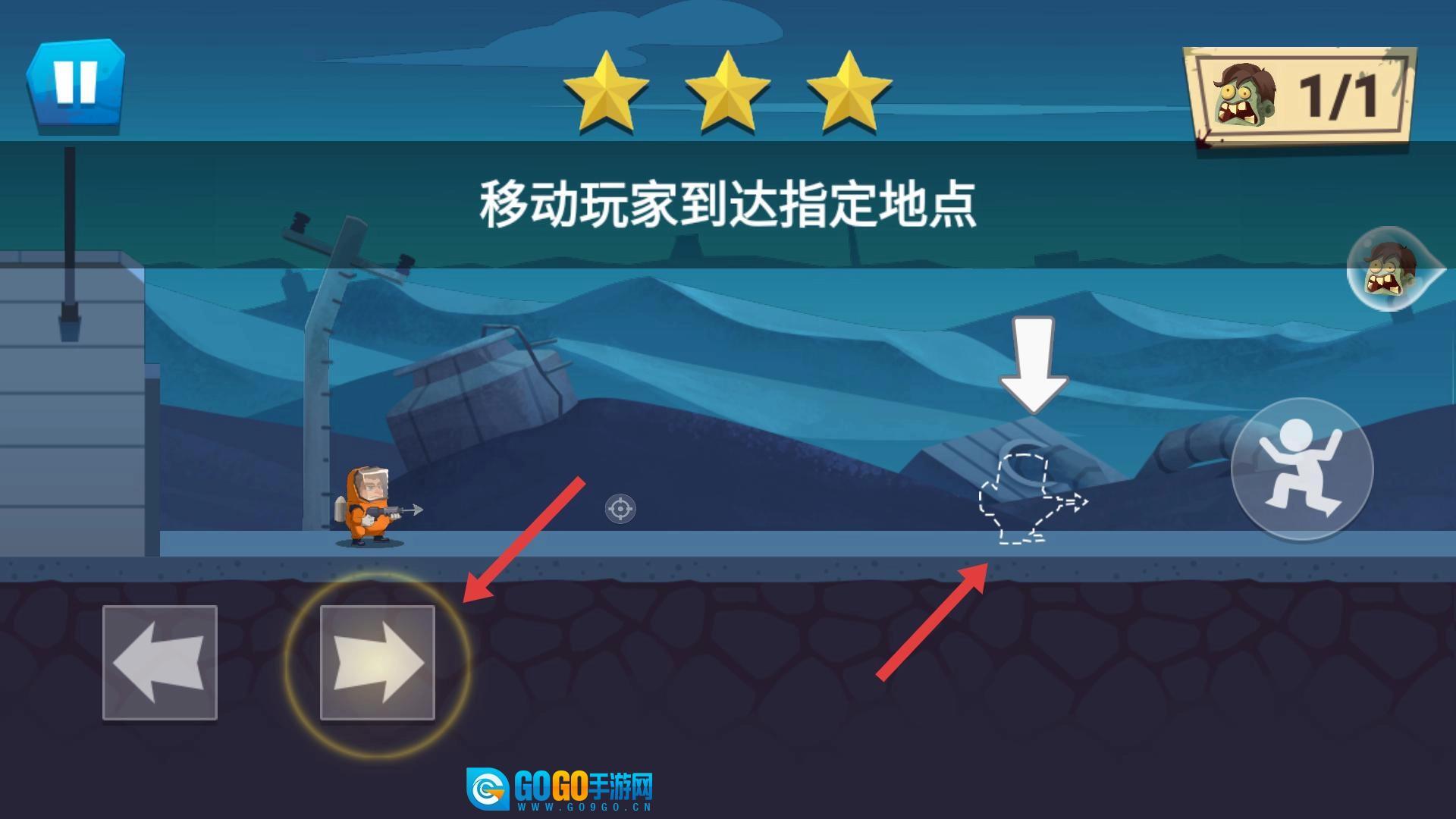 2、按照指引操作,通过左右箭头控制角色移动,前往指定位置,过程中需注意躲避障碍,抵达后即可完成当前阶段任务,从而积累通关进度。