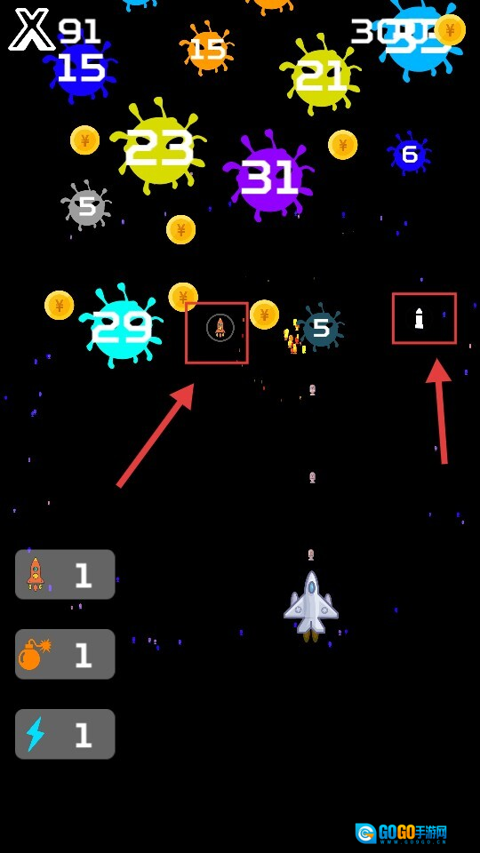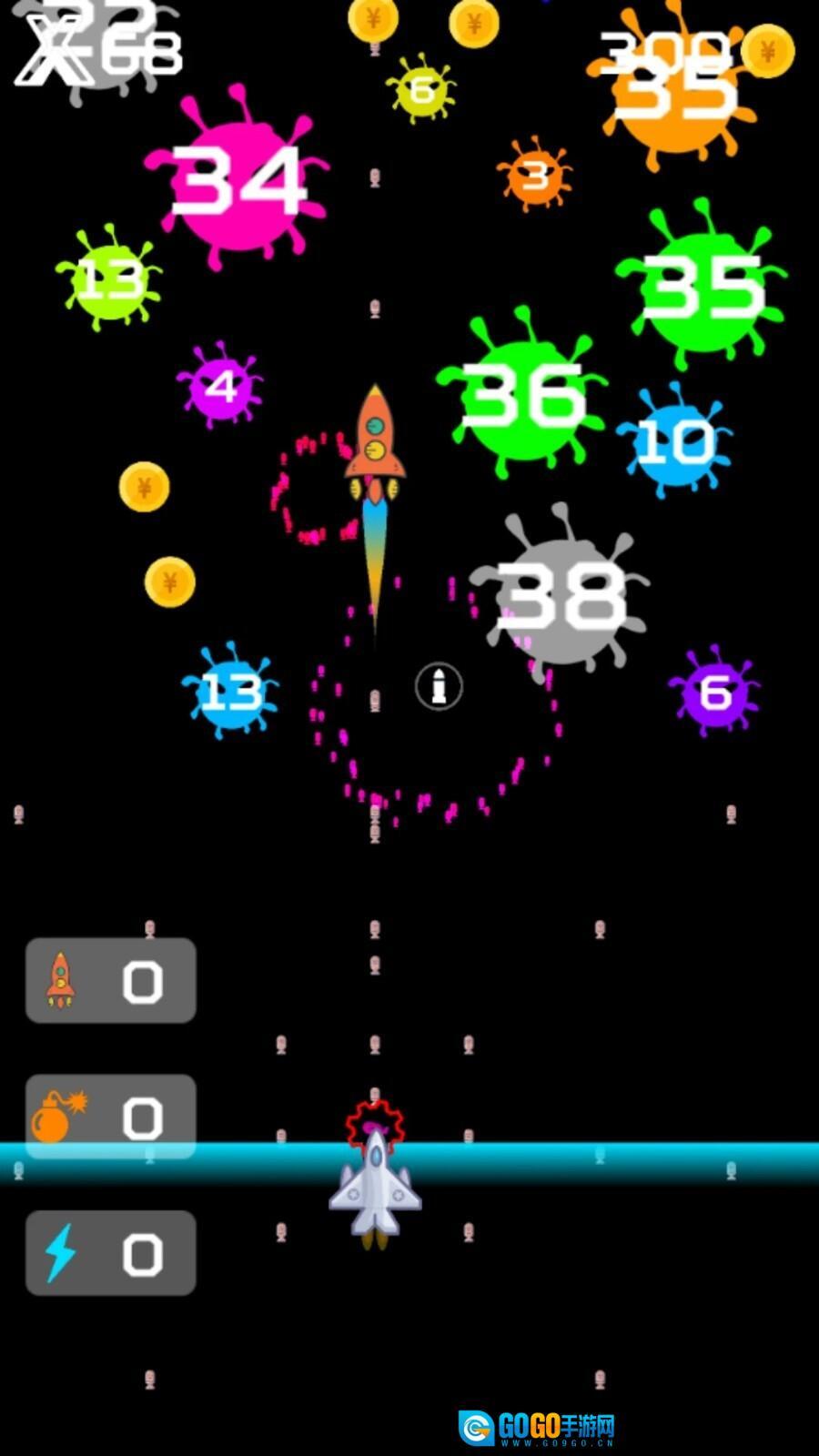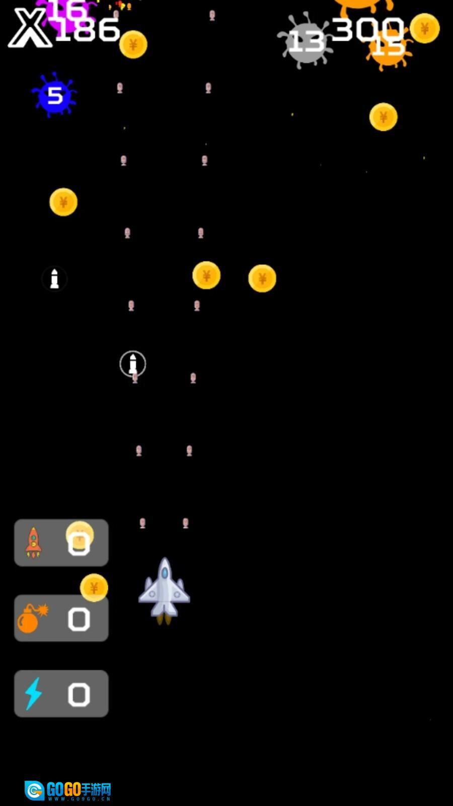 3、操控飞机对带有数字标识的【病毒-敌人】发起攻击,在此过程中收集【金币】,还要记得拾取空中的道具。