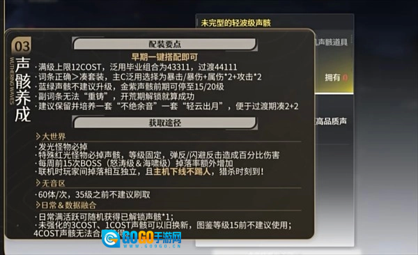 前期推荐主声骸荐推带绿鸟cost3、凑个风套(啸谷长风)过渡、等到12cost时可换飞廉之猩cost4主词条方面,cost4的位置选双爆,cost3的位置选风伤加成,cost1的位置选百分比攻击,毕业配置是43311。