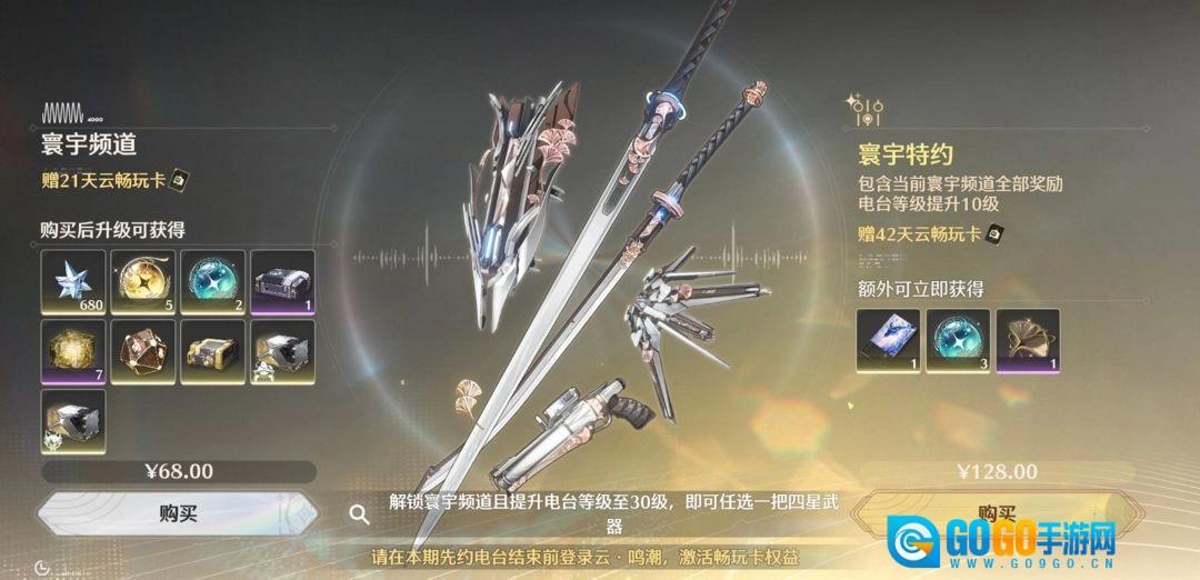 2、【寰宇频道】【寰宇特约】【寰宇特约升级】:购买上述商品后附赠的21/42日畅玩天数,需在对应商品到账后、当期【先约电台】活动结束前,登录《云·鸣潮》客户端领取。