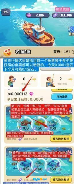 点击三条广告,每条广告可一次性获得168鱼票;完成广告后,每小时能按基础速率领取鱼票,每日总收益为基础速率乘以24小时。举例来说,若基础速率是208.33鱼票/小时,那么每日收益就是208.33×24小时=5000鱼票。