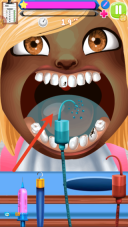 3、在规定时间里,依据提示先后运用探针、钻头、冲洗器、填充材料这类工具,借助点击、拖拽等操作来准确完成治疗流程。
