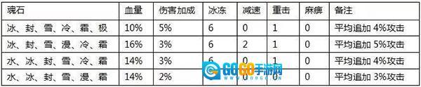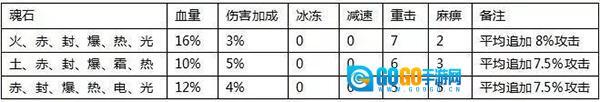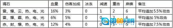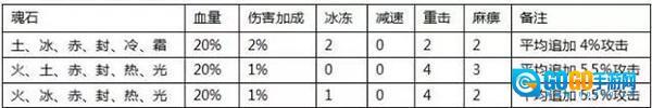 魂石组合效果有提高生命上限、伤害加成、伤害穿透、重击、麻痹、冰冻和减速,而且附加伤害。