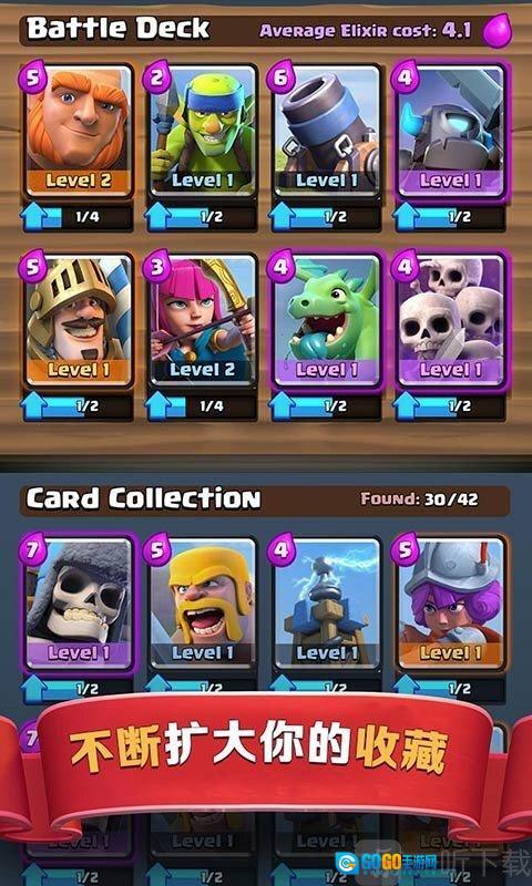 4. 收集皇室战争里的家族成员、熟悉的部落冲突中的军队、法术、防御建筑及其他卡牌,用于构建并升级你的卡组。