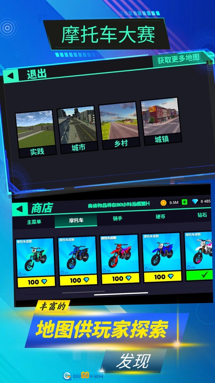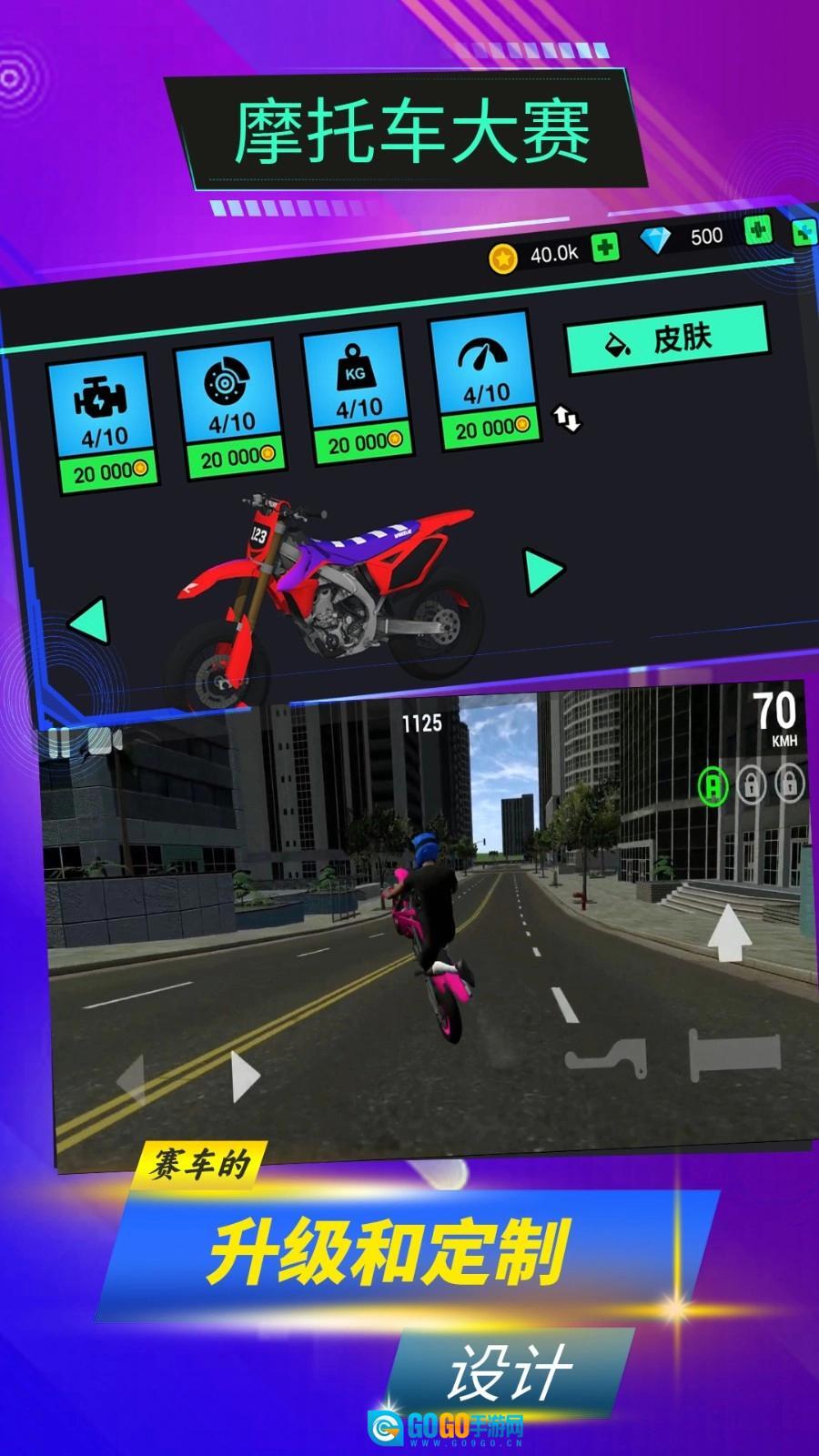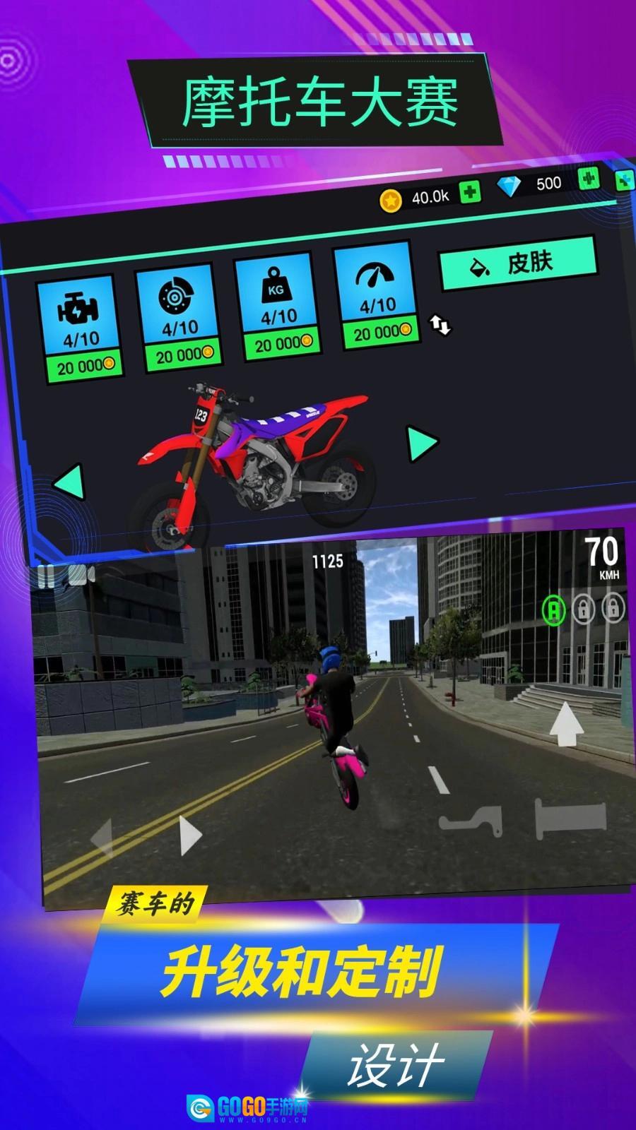 2、获取外观酷炫的摩托车以及前沿的赛车配件,在摩托车大赛的世界中铸就令人瞩目的顶级车手声誉。