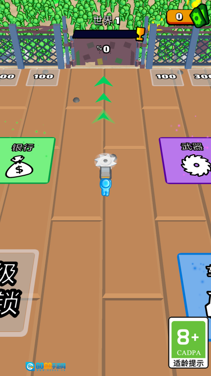 1、通过滑动屏幕来操控角色移动,在僵尸群中穿梭,当靠近僵尸时角色会自动发起攻击,使用武器砍杀那些绿皮僵尸。