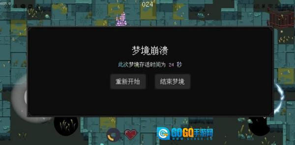 3.当角色生命值降为零时,会触发“梦境崩溃”机制,此时玩家可选择“重新开始”以继续游戏进程,也可选择“结束梦境”来退出当前游戏。