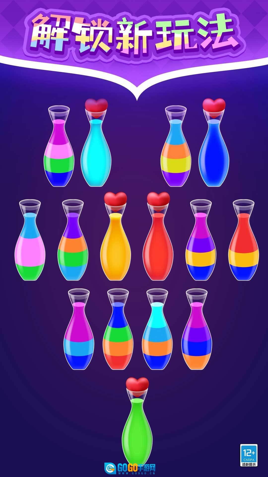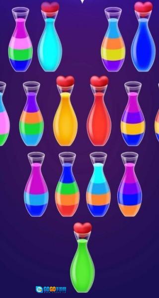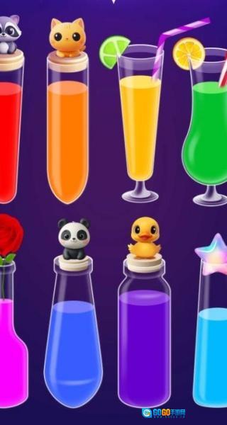 1、开始游戏时会看到多个盛有彩色液体的瓶子,需要通过倾倒液体的操作,把相同颜色的液体集中到同一个容器里。