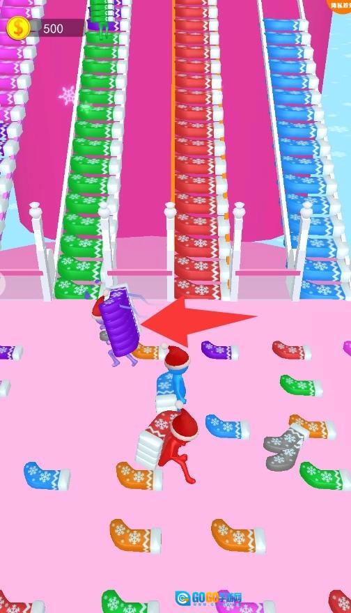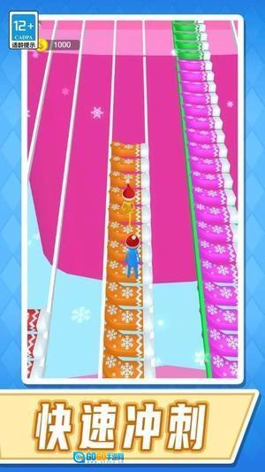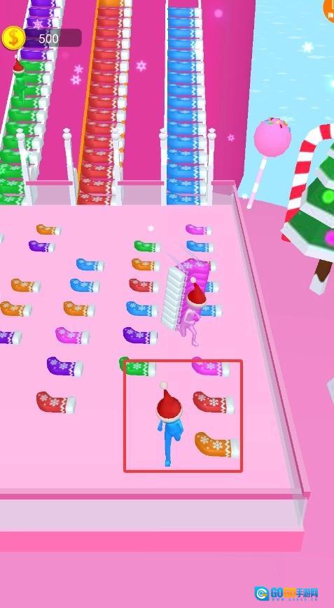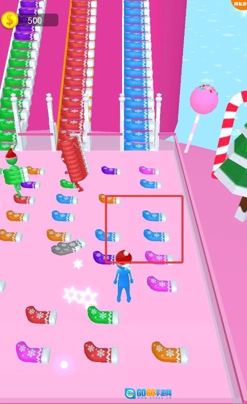 冰面上散落着色彩斑斓的圣诞袜,跑过去拾取与自己颜色相同的,这些都是搭建桥梁的关键材料,需要多收集一些。