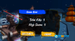 3、玩家若被僵尸击败,游戏即宣告结束,此时屏幕会呈现总击杀数量与最高得分。玩家可选择RESTART选项重新开启游戏,也能点击HOME按钮返回主菜单。