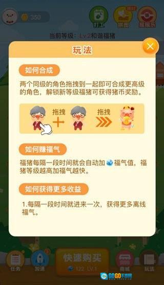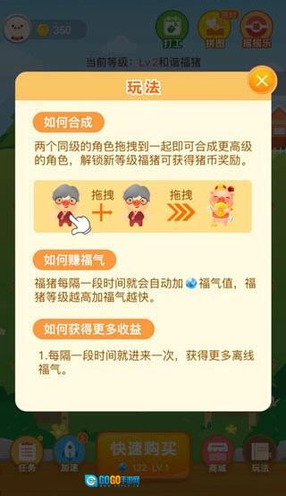 2、把两个相同等级的角色拖拽到一处就能合成更高等级的角色,解锁新等级的福猪还能得到猪币奖励。
