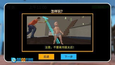 3、玩家将化身为小宝宝,在房子里展开探索以完成各项任务,在此过程中还需躲避邻居的追捕,并防止邻居抢先完成任务。