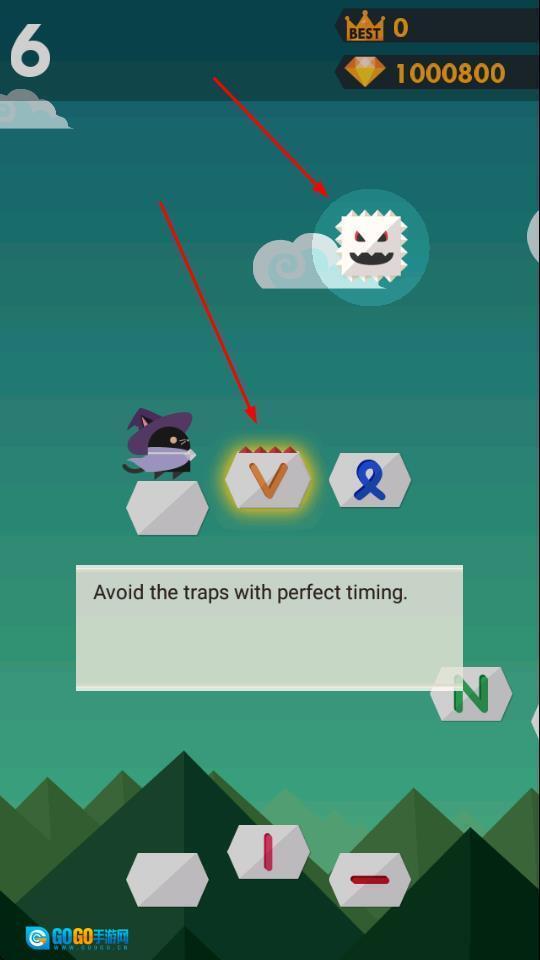3、遇到空中尖刺陷阱之类的障碍时,按照提示“Avoid the traps with perfect timing”,找准时机点击符号方块来避开危险,朝着更高分数发起挑战。