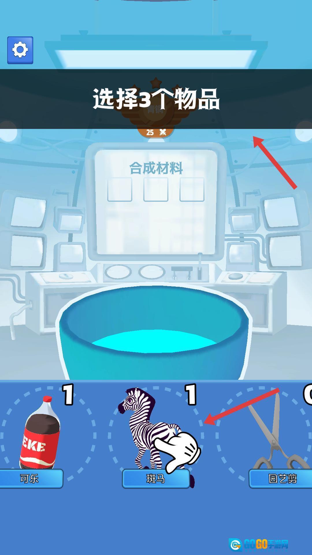 1、进入游戏后,会出现选择3个物品的提示,下方陈列着可乐、斑马、园艺剪等物品,需要从中挑选3个,为合成怪兽提前做好准备。