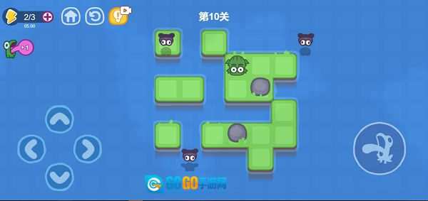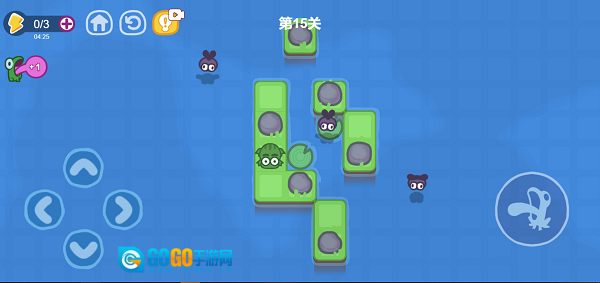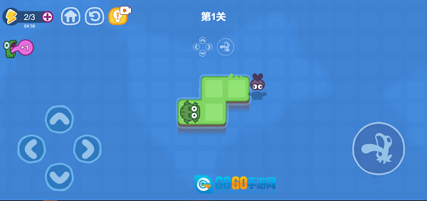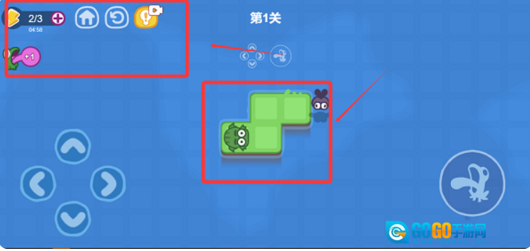 2. 左侧为操作按键区域,右侧的功能是通过吐舌动作勾取猎物,完成这一步便能进入下一关。
