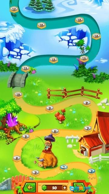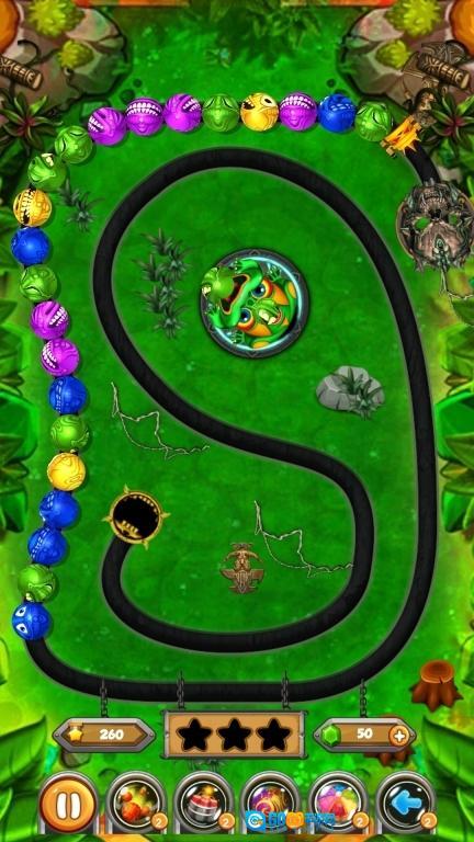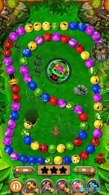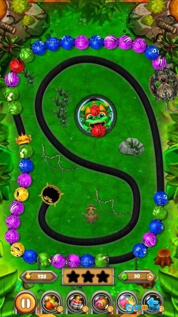 1、控制青蛙发射彩珠,轨道上相同颜色的珠子会消除,积累得分以解锁后续关卡。
