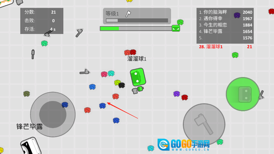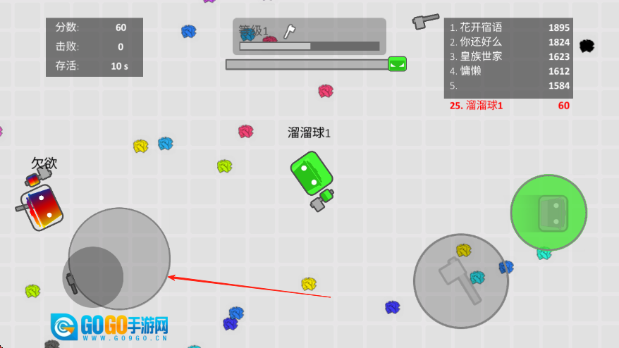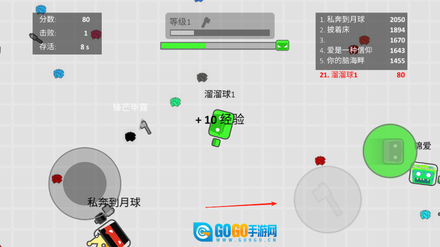 2、在游戏过程中要留意避开其他表现突出的玩家,通过圆圈去吸附标有红箭头的道具,以此积累经验值,提升自身等级。