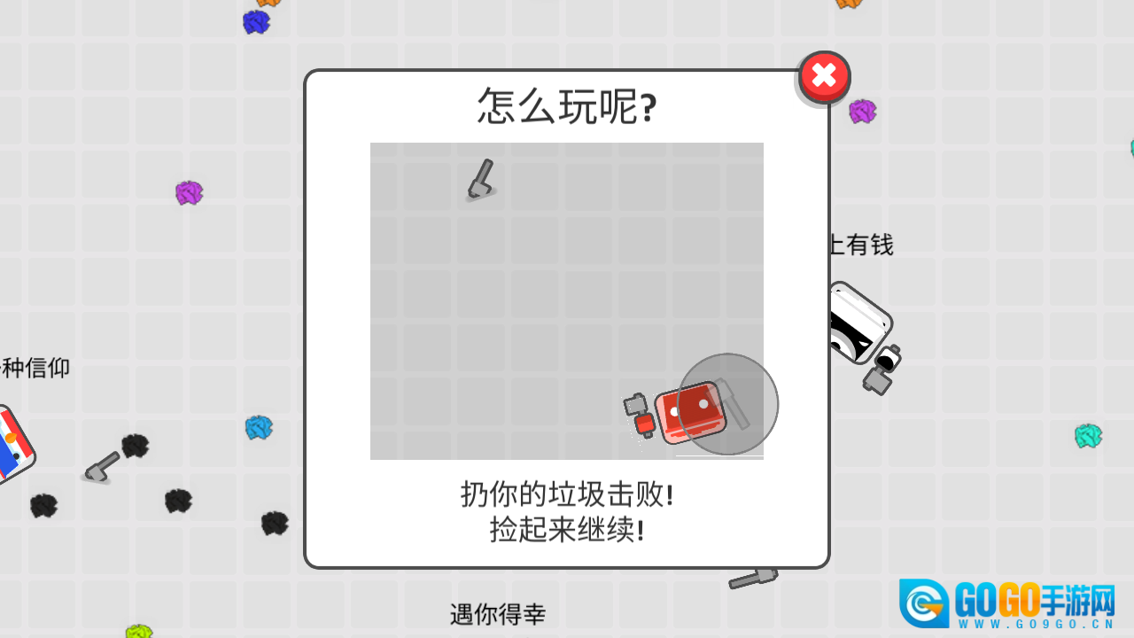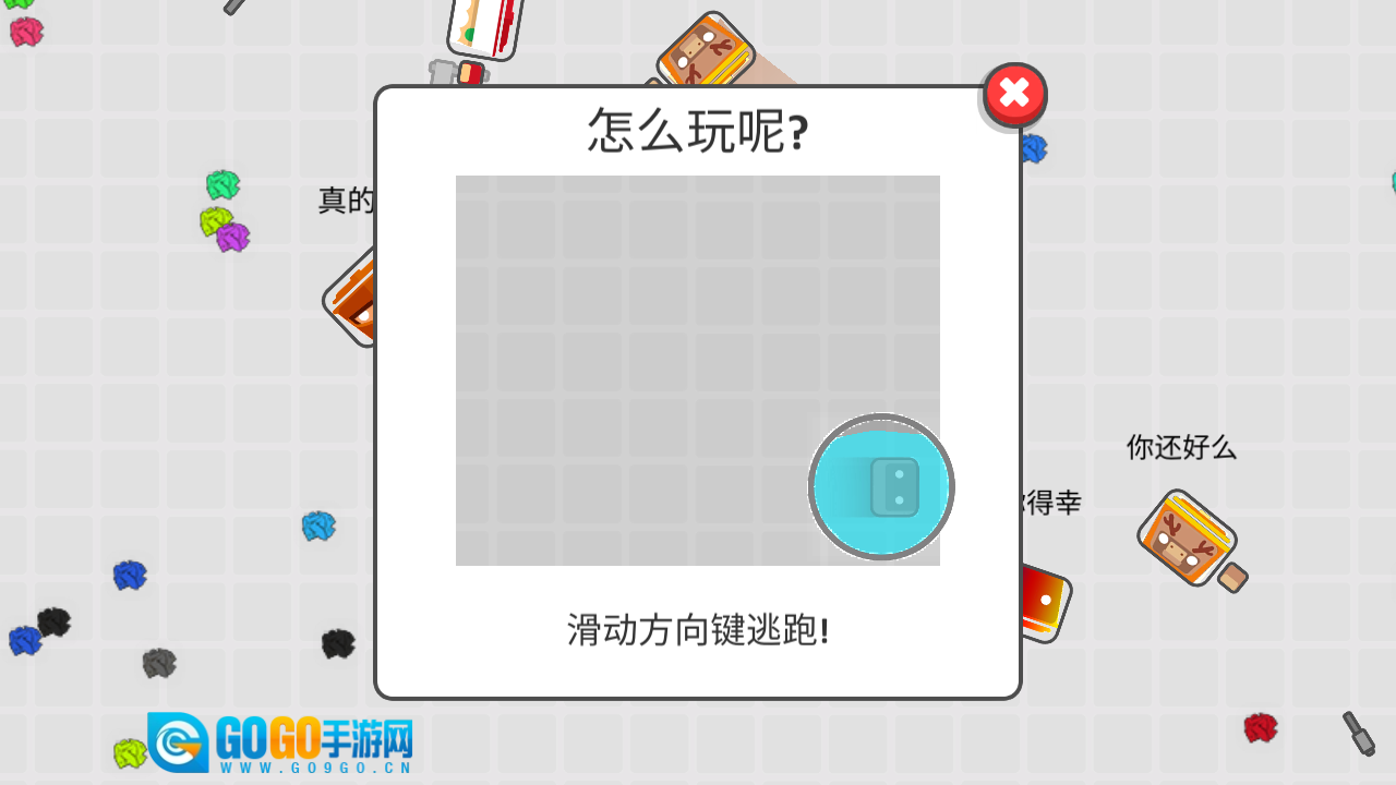 1、操控角色溜溜球1,移动带有红箭头的灰色圆圈,收集彩色道具,以此提升分数和延长存活时间。