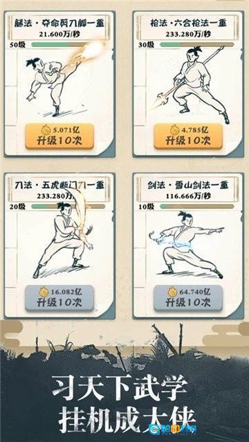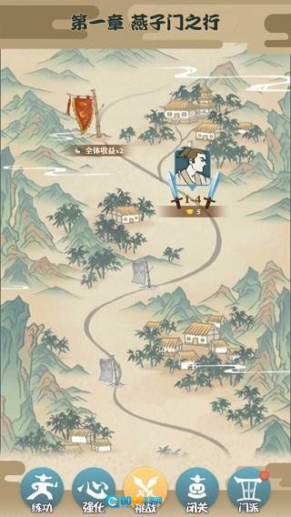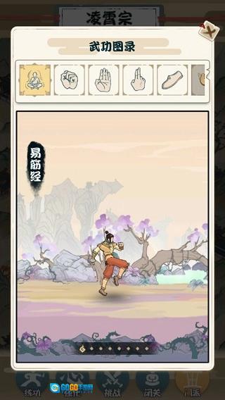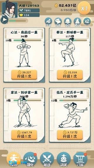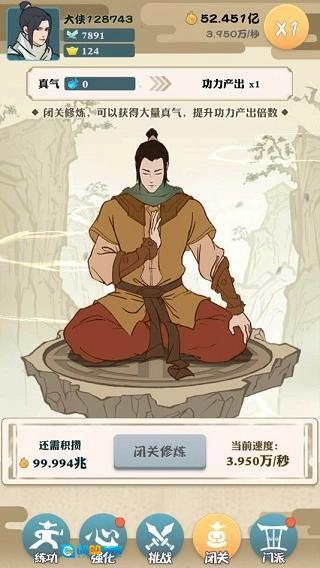 在“挑战”板块里,每个章节包含的关卡数目各不相同,点击关卡后会自动开启战斗,同时也能更换武学——无论是想用手掌、拳头还是脚都可以自由选择。关卡需要按顺序逐步解锁,完成对应关卡不仅能学会新的武学,还能获取额外的功力。功力和战力都与武功等级相关,等级越高,相应的产出也就越多。要是想提高功力的产出倍数,那就去进行闭关修炼吧!