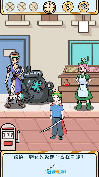 ①⭐点击左下角的机器获取超级黑钻,将超级黑钻给主角使用后,点击右侧的药剂商人,把商店界面向上滑动,选择购买装备破坏药剂;接着点击左边的强化师,把武器放入左侧的方框中,再将装备破坏药剂放进中间的小框内,最后点击开始按钮。