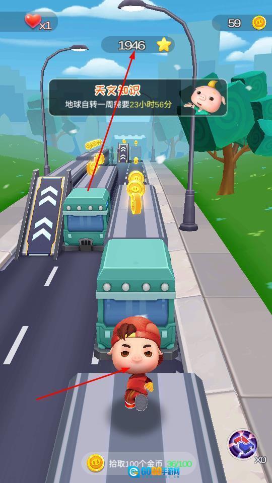 3、在跑酷的过程里,会弹出一些知识小窗口,像地球自转一圈需要23小时56分这类知识就会呈现;同时要达成收集金币的目标,需要拾取100个金币,之后继续向前推进,去挑战更遥远的距离和更出色的分数。