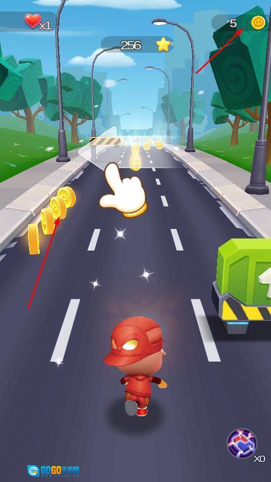 在游戏里操控猪猪侠沿着道路奔跑,通过滑动屏幕来调整移动方向,收集道路旁和空中的金币,与此同时要避开车辆与障碍,注意观察上方诸如256、1946这样变化的分数,积累闯关的成绩。